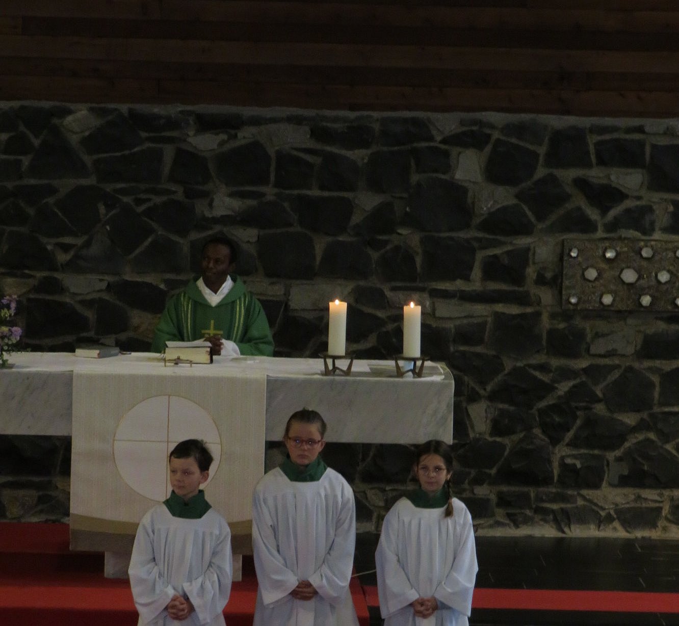 Nach wochenlanger Vorbereitung mit unseren Ministrantenbeauftragten, Johanna Gräf und Nele Jung, sind die "Neuen" bestens auf ihren Dienst vorbereitet. Dies sind Dina Bauch (Wel), Lydia Schnee (GU) und Paul Schöndorf (GU). Sie stehen vorne in der Mitte.