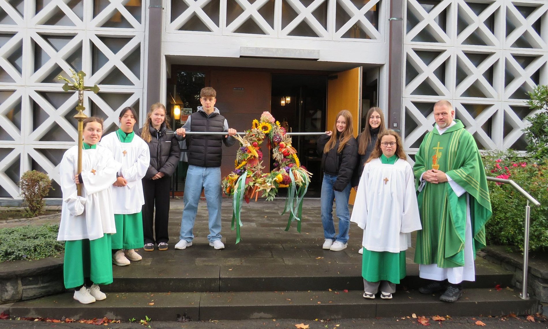 Gemeinsam mit Herrn Kaplan Thiel und den Messdienerinnen zogen die Jugendlichen mit der Erntekrone in das Gotteshaus ein.