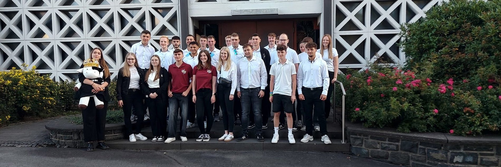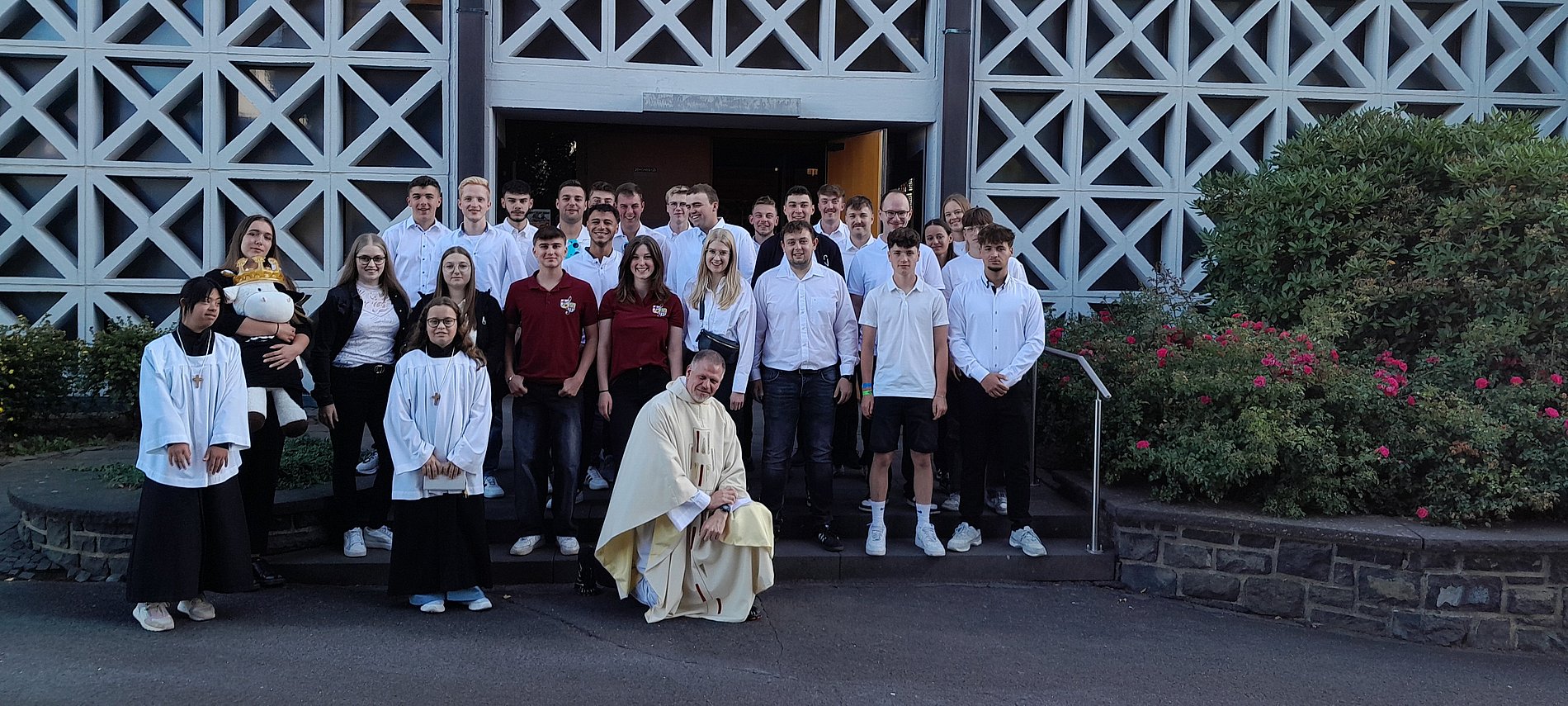 Vor dem Gottesthaus stellten sich die Kirmesjugend und Kaplan Thiel mit den Messdienern dem Fotografen und zogen anschließend zusammen in die Kirche ein.