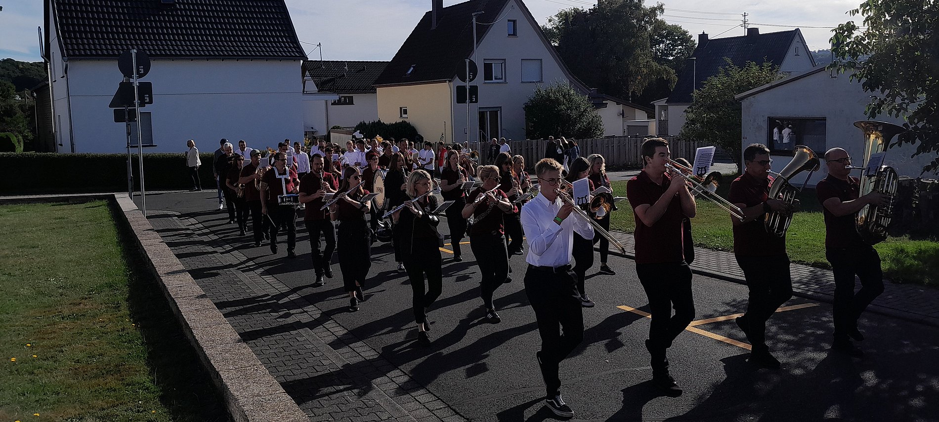 Vor der Kirche wartete der Musikverein Guckheim auf die Kirmesjugend und die Gottesdienstbesucher. Mit klingendem Spiel zogen sie durch die Guckheimer Straßen zum Kirmesplatz ins Festzelt.