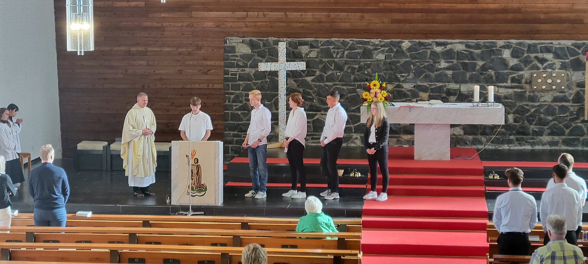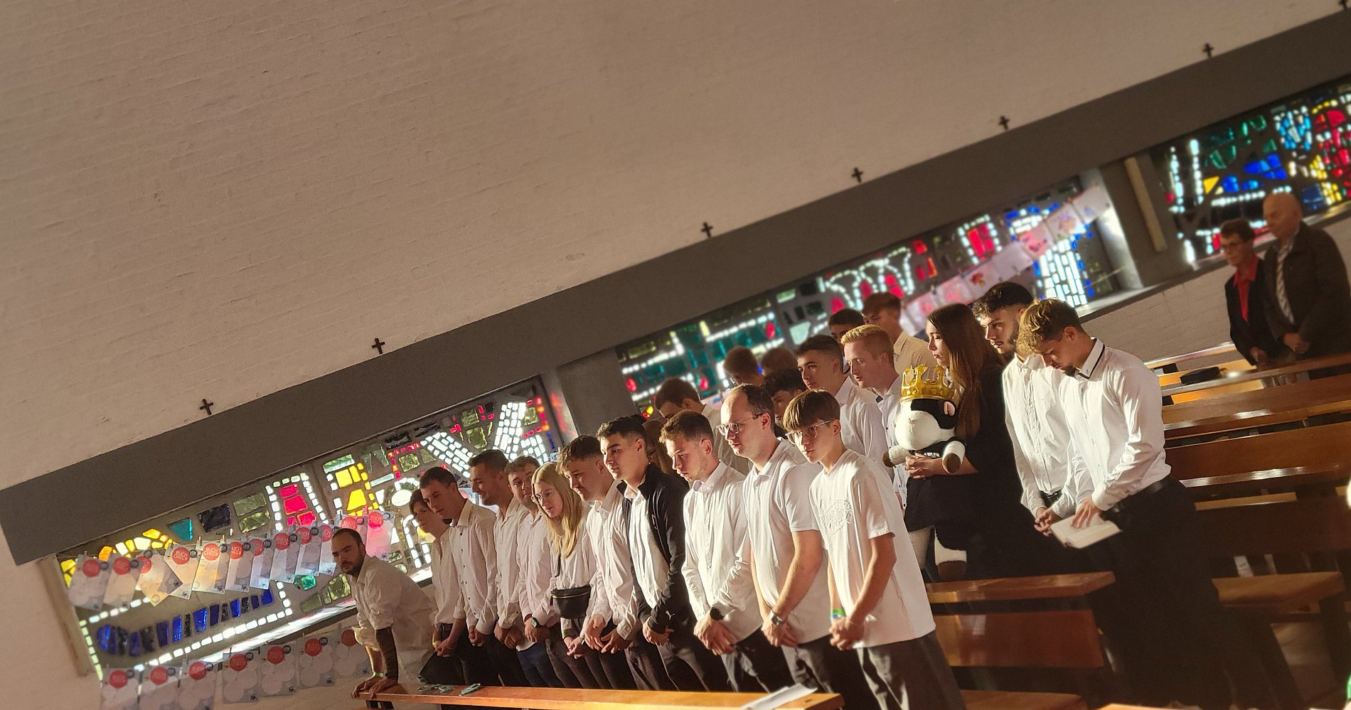 Die jungen Menschen nehmen in den ersten Bänken Platz
