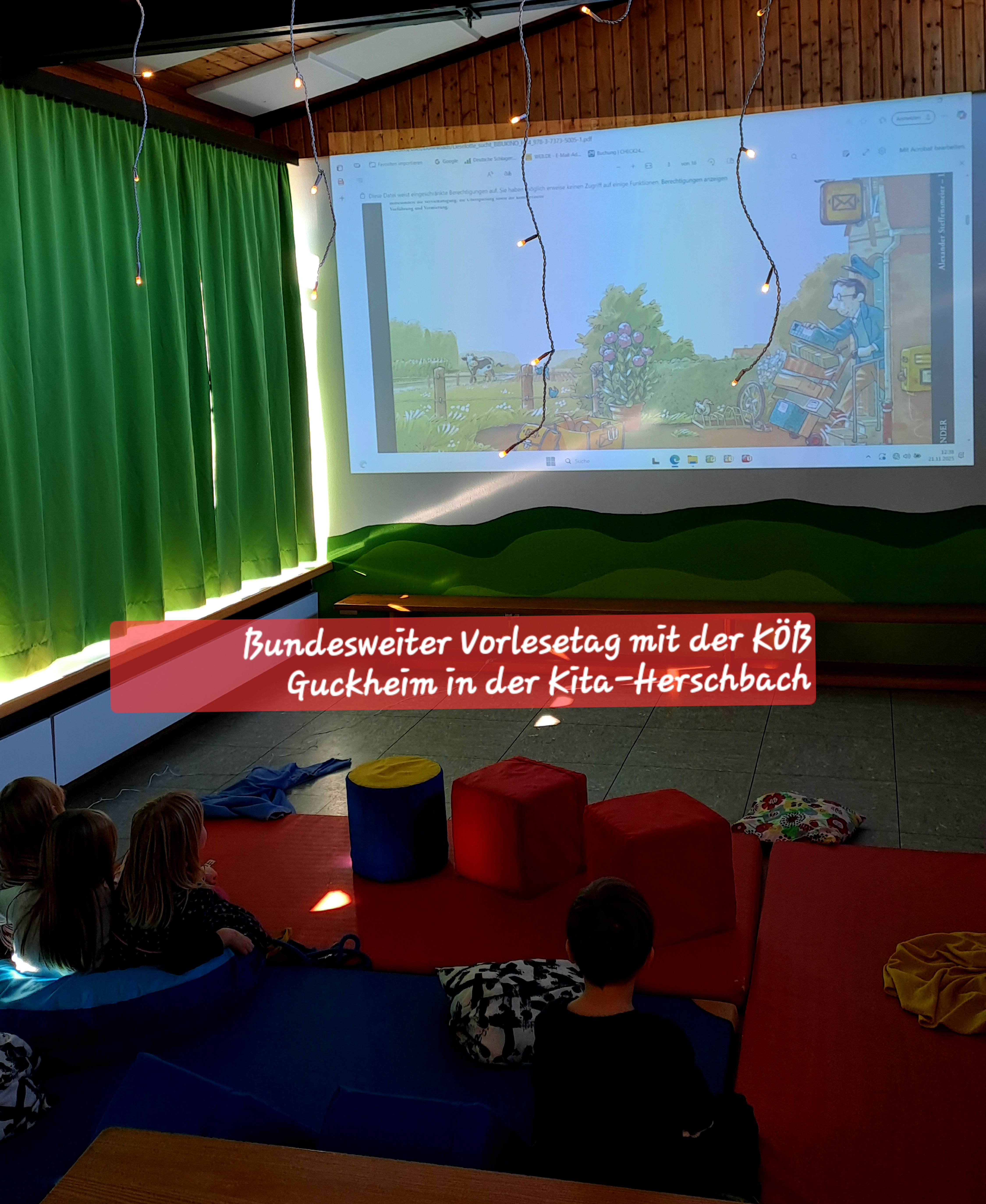 Am Freitag, den 21. November war es so weit, der Bundesweite Vorlesetag fand in der KITA -Herschbach morgens und in der Bücherei Guckheim nachmittags statt.In Herschbach wurde die Kindergartenturnhalle zweckentfremdet und zur gemütlichen Kuschelecke auf Matten mit Decken und Kissen gemacht.Die abgedunkelte Beleuchtung und der Weg durch einen Lichtertunnel sorgte schon am Anfang für Spannung bei den Kids.Es wurden mehrere Geschichten vom Kleinen Wir,Liselotte und dem Neinhorn vorgelesen und die 40 Kindergarten Kids waren begeisterte Zuhörer. Zum Schluss bekamen die Kinder als Dankeschön fürs Zuhören eine kleines Buch von der Stiftung Lesen geschenkt.
